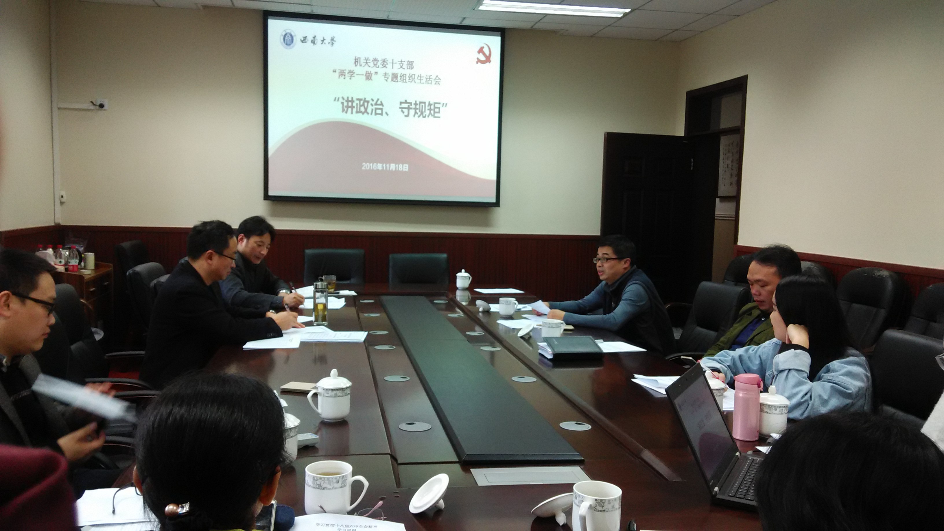 11月18日下午,十支部根据《中共西南大学委员会关于“两学一做”学习教育实施方案》的要求,开展“讲政治、守规矩”专题学习研讨会。学习形式是个人自学和集中学习相结合。