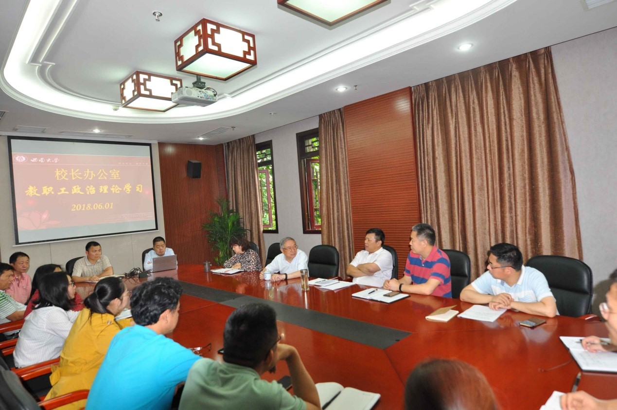 6月1日下午,校长办公室召开政治理论学习活动,专题学习习近平总书记在中国科学院第十九次院士大会、中国工程院第十四次院士大会上的讲话精神。张卫国校长、向仲怀院士出席会议,校长办公室全体职工参加学习。